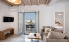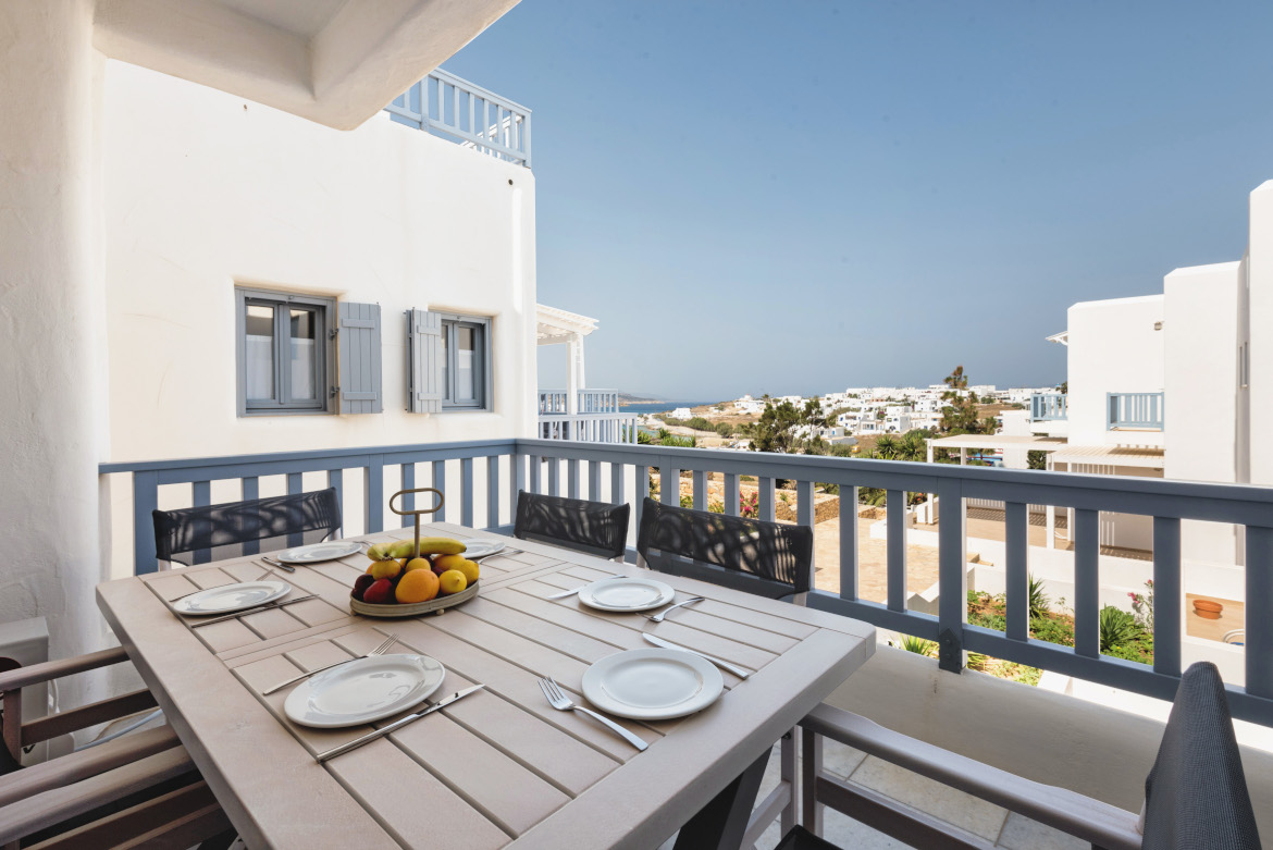 - Βεράντα με θέα προς τη θάλασσα, το λιμάνι και τον παραδοσιακό οικισμό. Η βεράντα έχει πρόσβαση από το σαλόνι και το υπνοδωμάτιο και είναι εξοπλισμένη με τραπέζι και 6 καρέκλες.