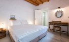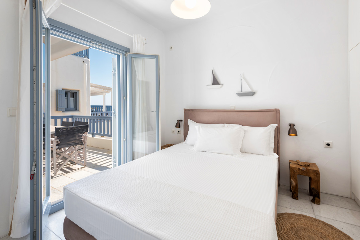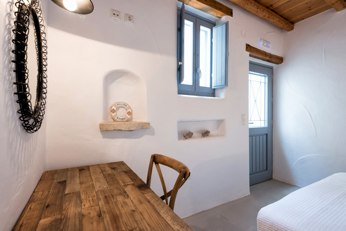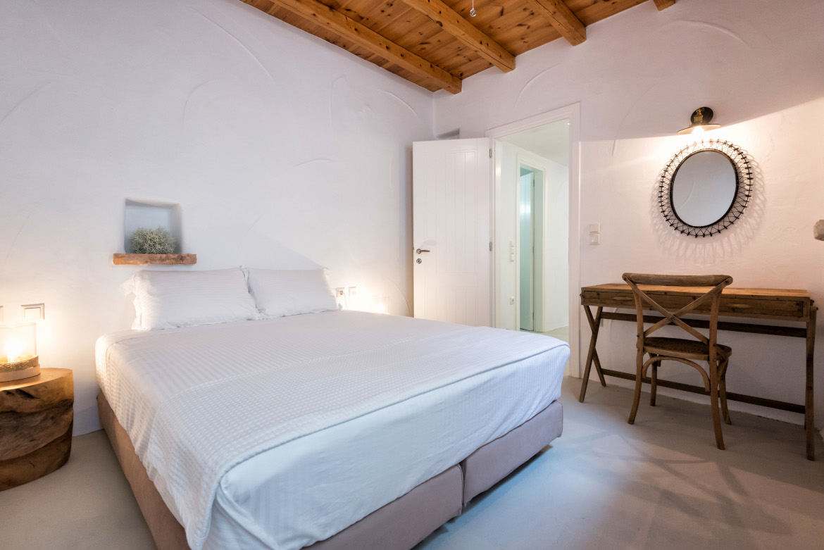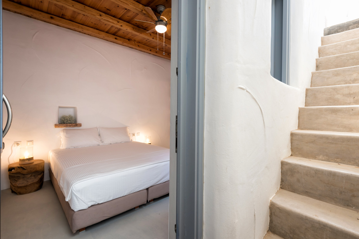 - μεγάλο υπνοδωμάτιο με διπλό κρεβάτι (1.60m X 2.00m), παράθυρο και πόρτα προς τον εξωτερικό χώρο και ανεμιστήρα οροφής