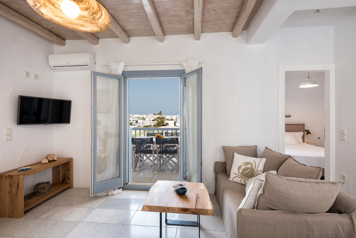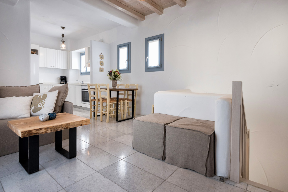 - Καθιστικό – τραπεζαρία με καναπέ, τραπεζαρία 6 ατόμων, κλιματιστικό και τηλεόραση