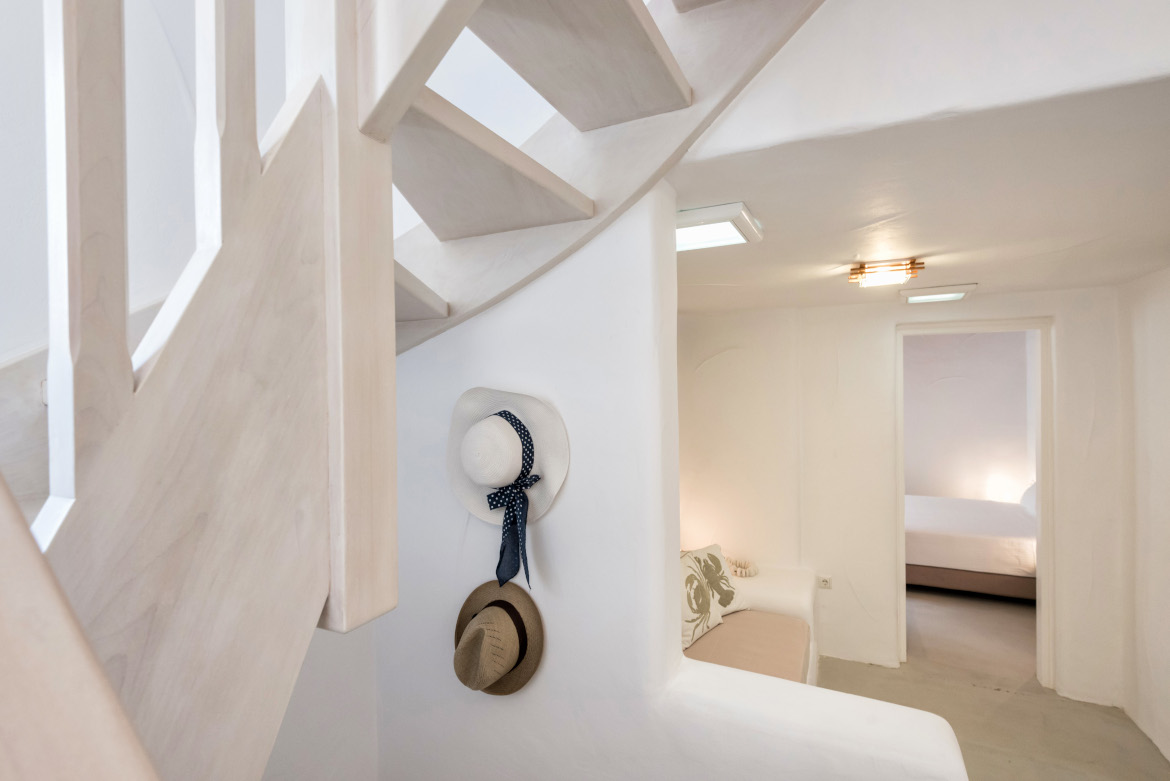 Κυκλαδίτικη αρχιτεκτονική συνεπάγεται εκτυφλωτικά λευκά σπίτια και ζωγραφισμένα με ασβέστη γραφικά σοκάκια. Από το χαρακτηριστικό λευκό του Αιγαίου, πήρε το όνομά της η κατοικία. Μεζονέτα σε λιτό στυλ, αποτελούμενη από δύο επίπεδα, προσφέρει άνεση και λειτουργικότητα.